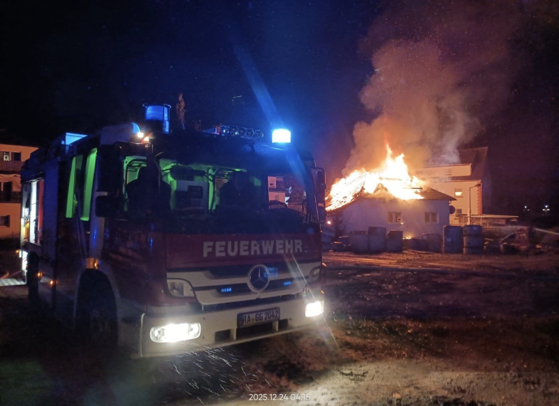 Einsatz Nr. 39Am 24.12.2025 um 03:52 Uhr wurde die Feuerwehrabteilungen Gernsbach, Gaggenau, Ottenau und Hörden zu einem B3 - Dachstuhlbrand nach Gernsbach in die Bleichstraße alarmiert. Beim Eintreffen der Feuerwehr stellte sich folgende Lage dar: Da sich keine Personen mehr im Wohngebäude aufhielten, konzentrierte man sich auf die Löschmaßnahmen. Mit zwei Trupps und zwei C-Rohren bekämpfte man den Brand. Als die Drehleiter DL 23/12 der Feuerwehr Gaggenau eingetroffen und aufgestellt war, übernahmen wir die Wasserversorgung. Um 5:30 Uhr war der Brand unter Kontrolle. Die umfangreichen Nachlöscharbeiten waren sehr zeitaufwendig. Deshalb kamen auch die Höhenrettungstruppe zum Einsatz. Ebenfalls war auch die Drohneneinheit der Feuerwehr Rastatt im Einsatz. Um 9:30 Uhr wurden wir aus dem Einsatz heraugelöst. Nachdem das Löschfahrzeug wieder sauber, bestückt und getankt war, konnten wir kurz nach 10 Uhr den Einsatz beenden. Eingesetzte Kräfte (Abteilung Ottenau): 14 Eingesetzte Fahrzeuge (Abteilung Ottenau): LF 10 (2/42), KDOW Gagg. (1/10) Eingesetzte Fahrzeuge (Abteilung Hörden): LF 10 (5/42), Eingesetzte Fahrzeuge (Abteilung Gaggenau): DL 23/12 (1/33), KDOW Gagg. (1/10) Andere Hilfsorganisationen: Polizei, RTW DRK-Rettungsdienst Mittelbaden, Feuerwehr Abt. Gernsbach, KBM v.D., DRK-OV Gernsbach, Feuerwehr Rastatt, Höhenretter Mittelbaden, THW Rastatt Einsatzdauer: 6,5 Std.